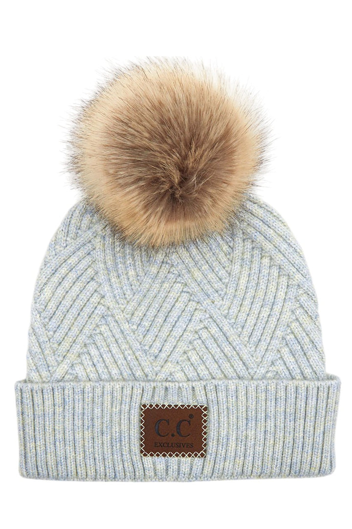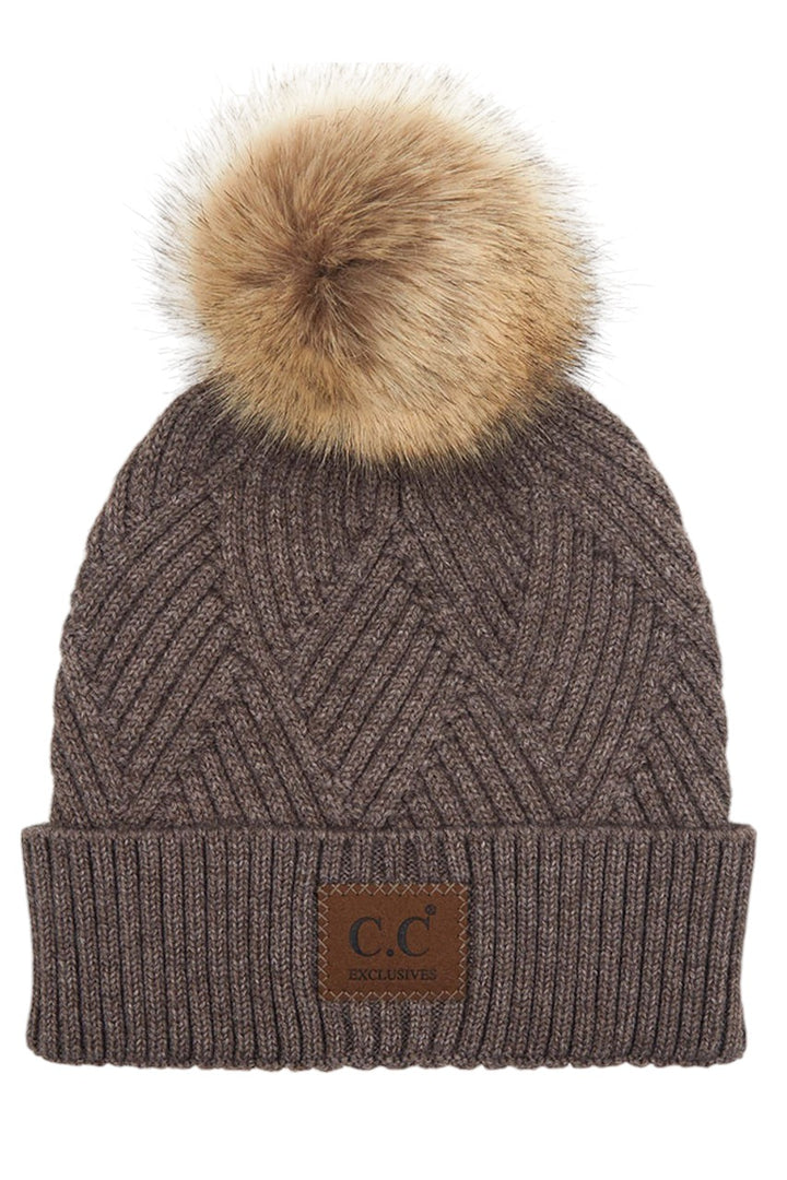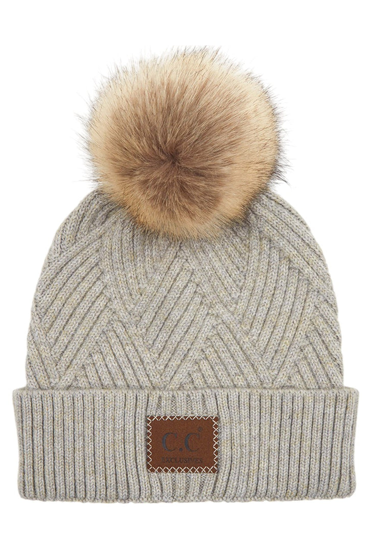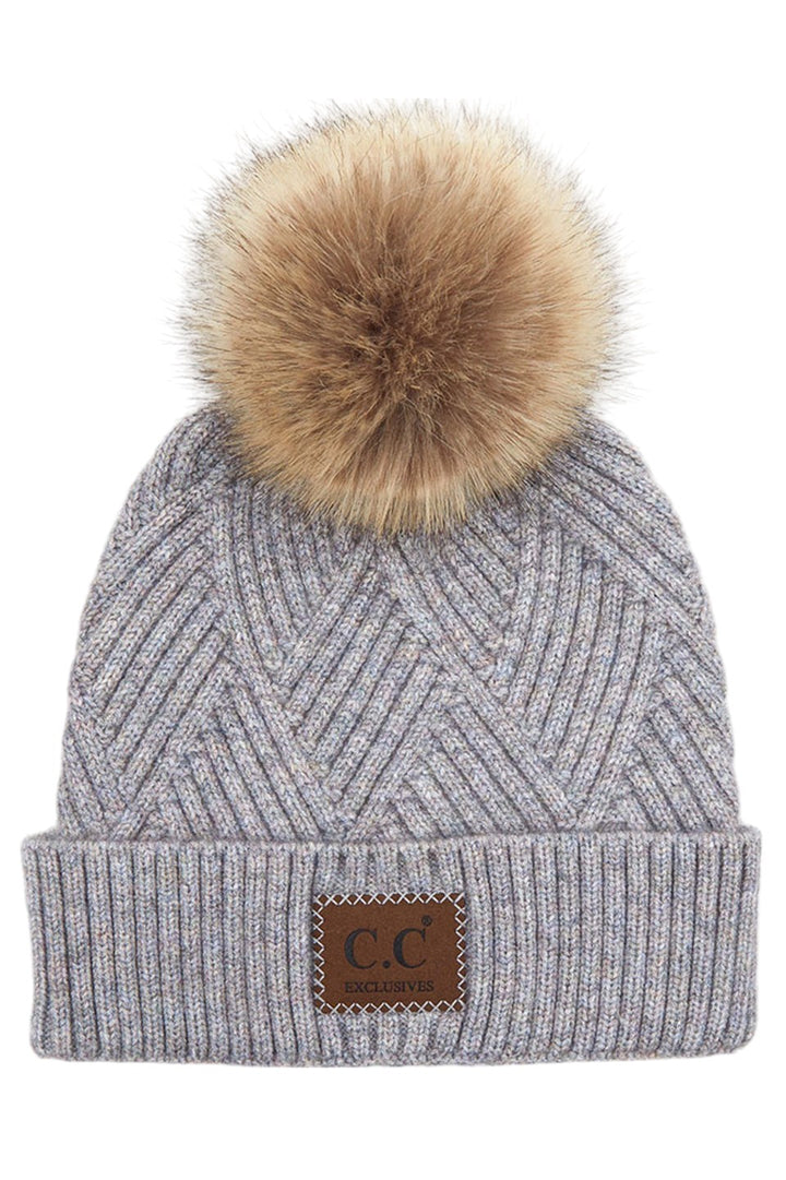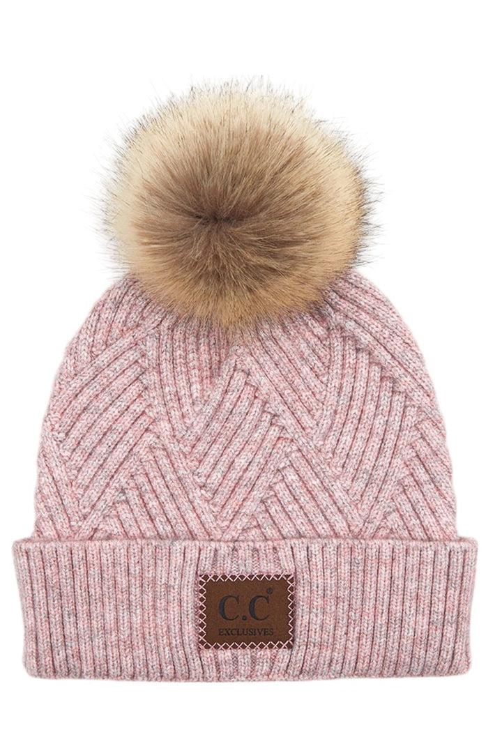 - C.C Heather Beanie Pom Hat With Suede Patch In Diagonal Stripes Criss Cross Pattern