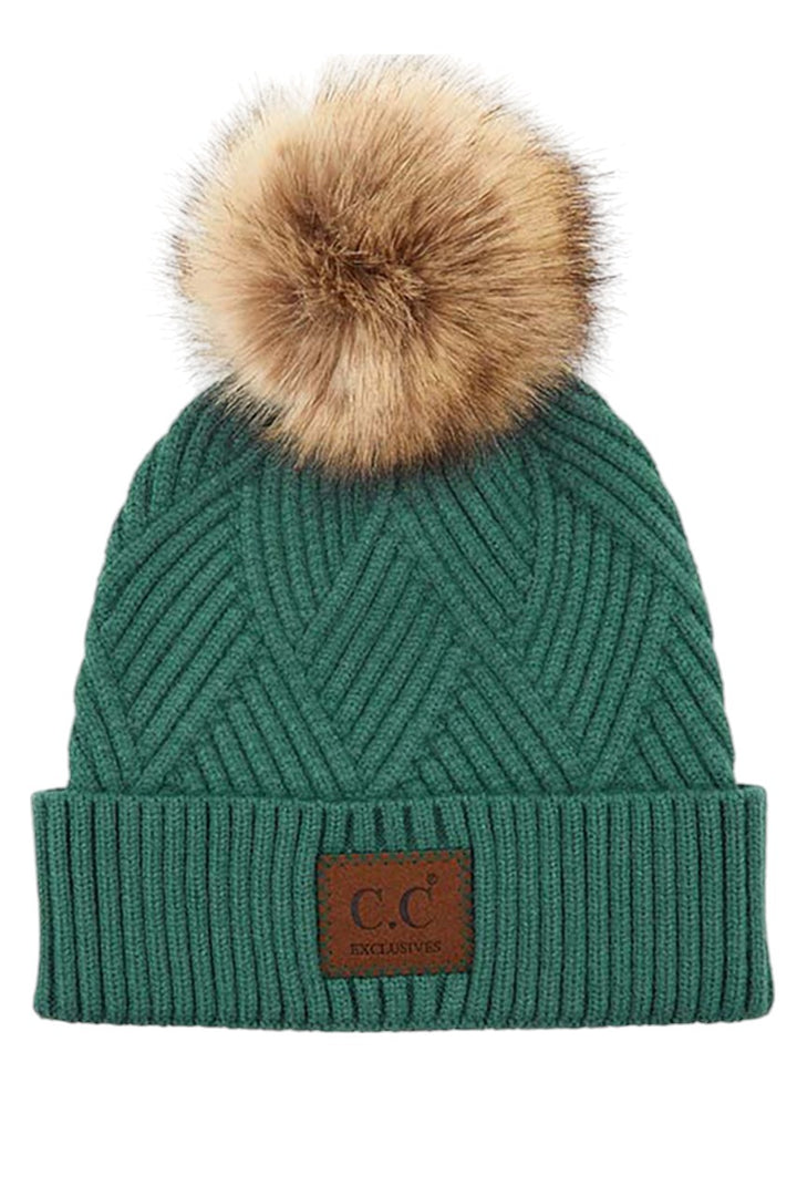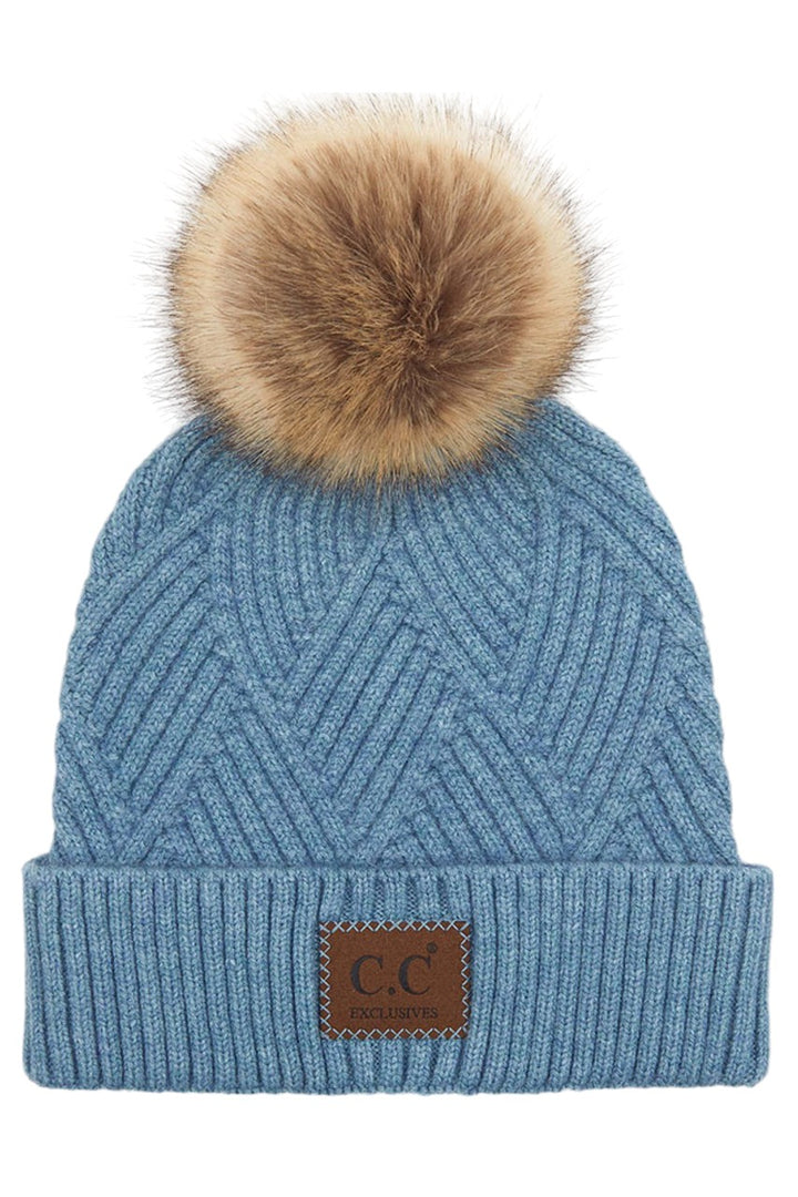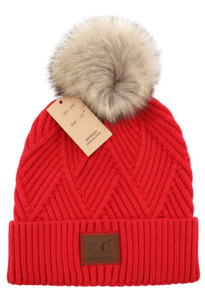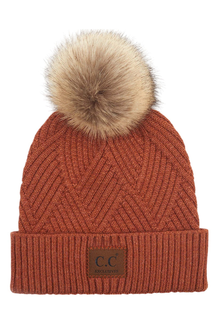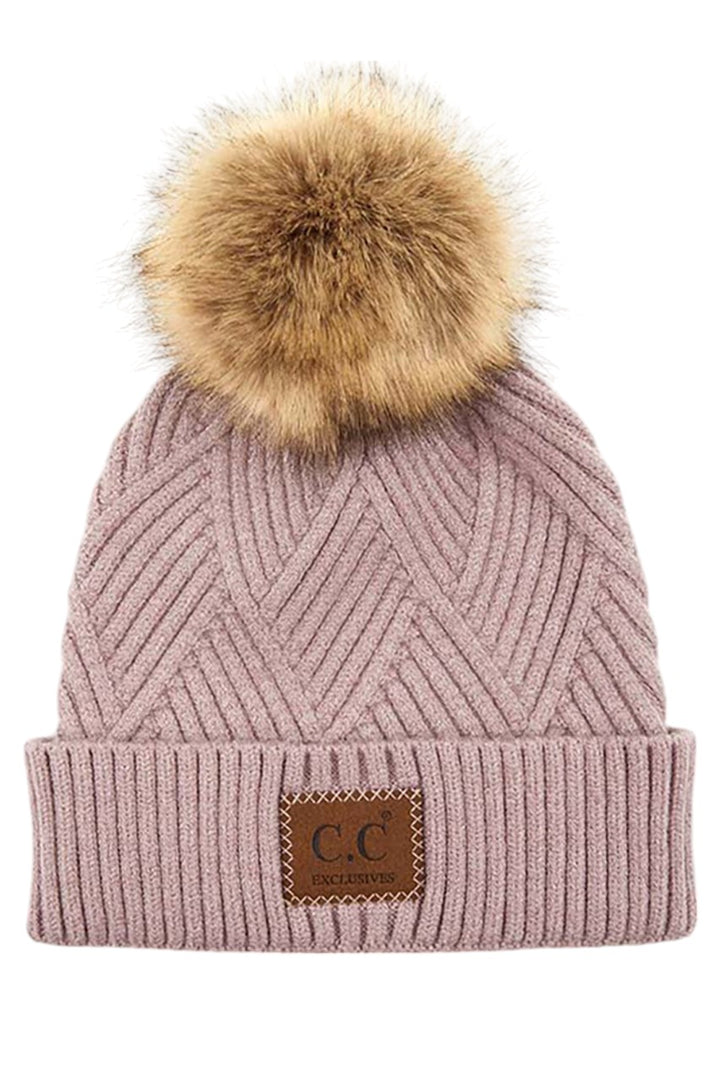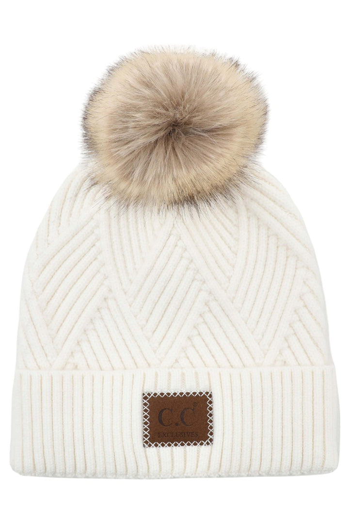 - C.C Heather Beanie Pom Hat With Suede Patch In Diagonal Stripes Criss Cross Pattern