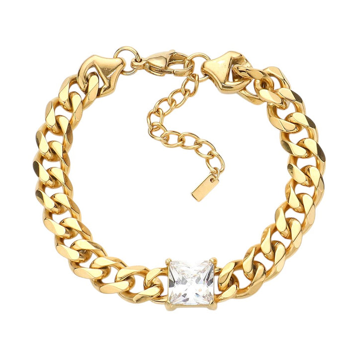 • 18K Gold Dipped Stainless Steel CZ Square Stone Accented Chain Link Bracelet