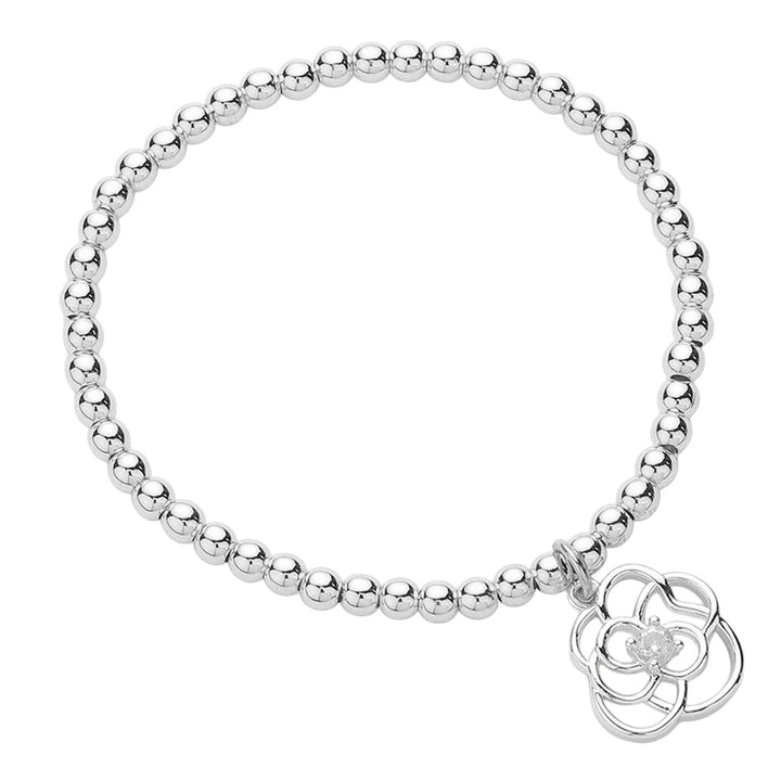 • Stone Pointed Rose Charm Stainless Steel Ball Beaded Stretch Bracelet